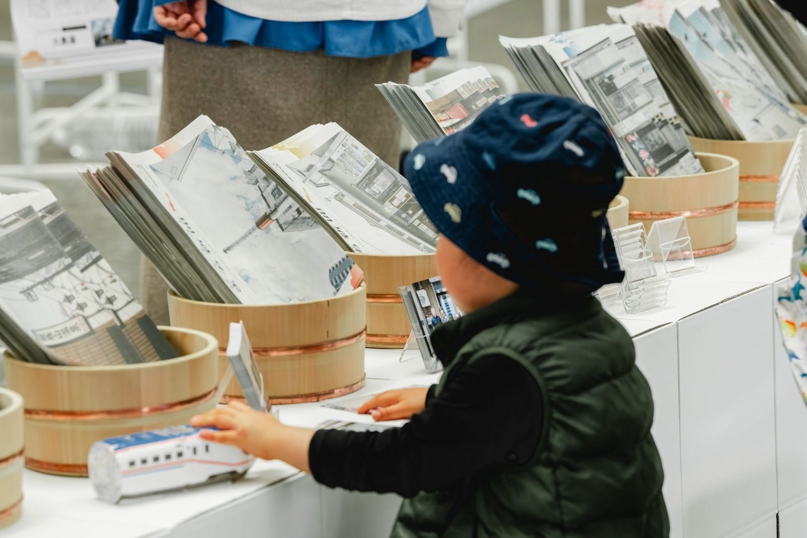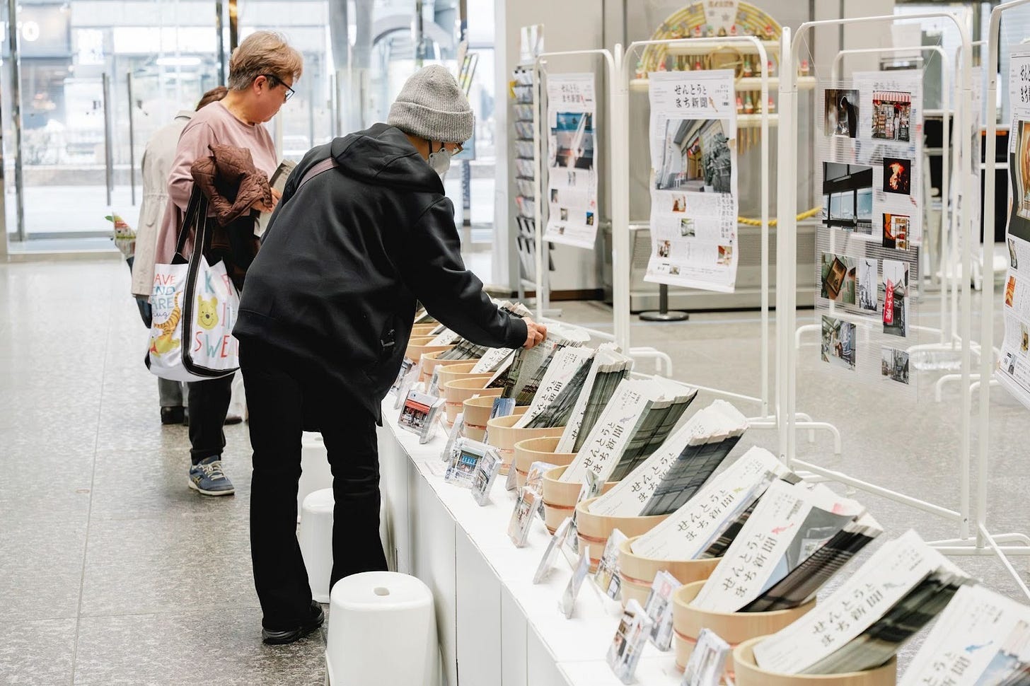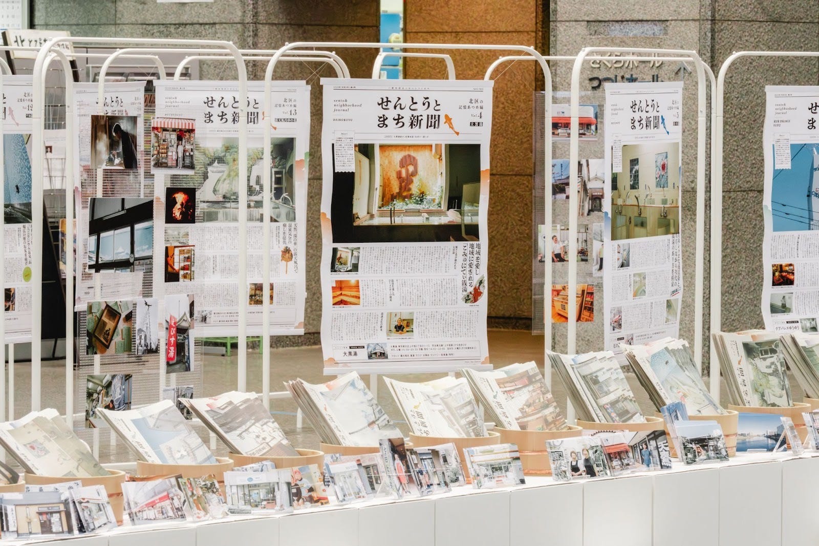 北とぴあのエントランススペースで、これまで発行した北区銭湯21軒分の『せんとうとまち新聞』を一挙公開・配布