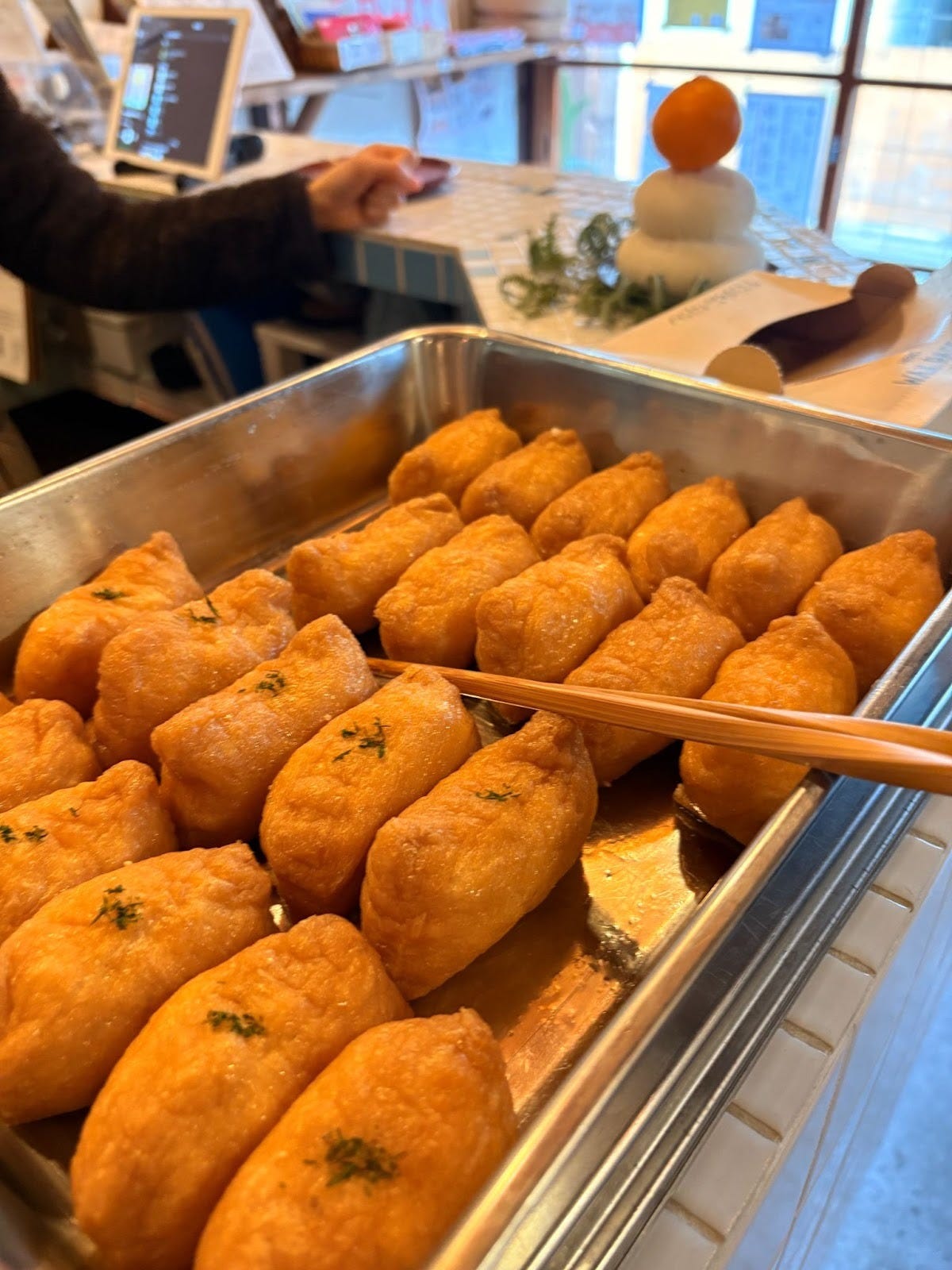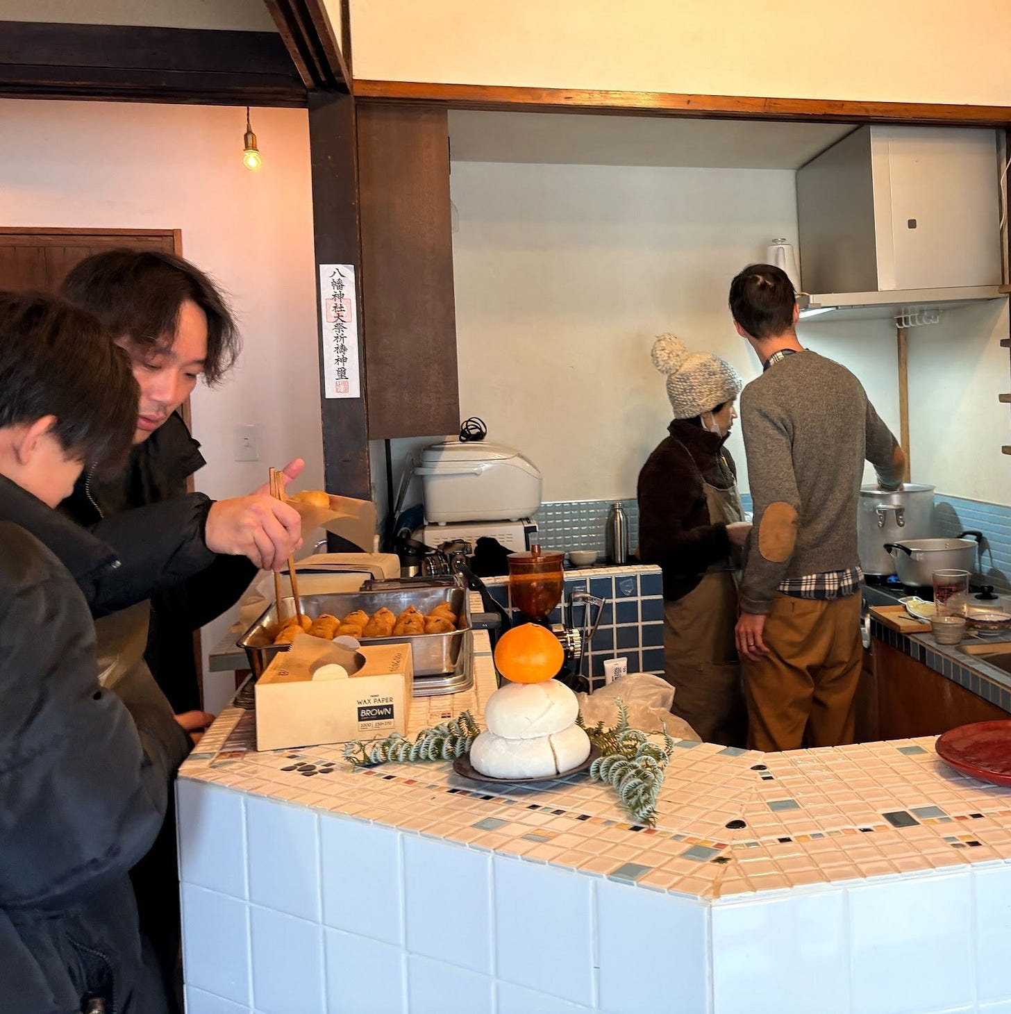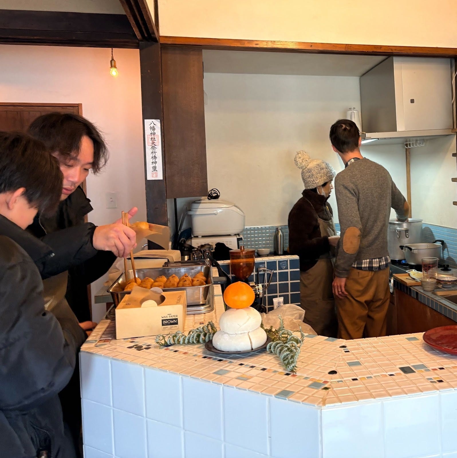 稲荷湯長屋での定期営業を経て、11月にご近所に新店舗を構えた「かようびのおいなりさん」も、去年に続いておいなりさんを無料で提供するかたちで参加していただきました。また、稲荷湯の玄関でも美味しい杏仁豆腐が販売され新年から賑わいました。